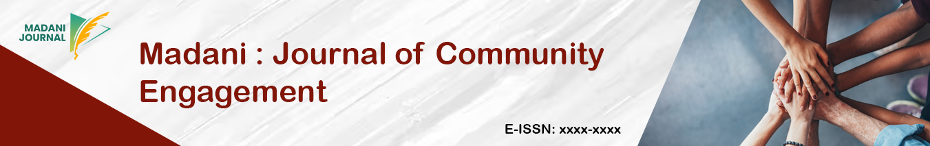 Madani : Journal of Community Engagement contains various activities from diverse groups of people in handling and managing the various potentials, obstacles, challenges and problems that exists in the society. Implementation of service activities also involve the participation of the community and partners. Service activities are organized into an activity aimed at improving the welfare of society.